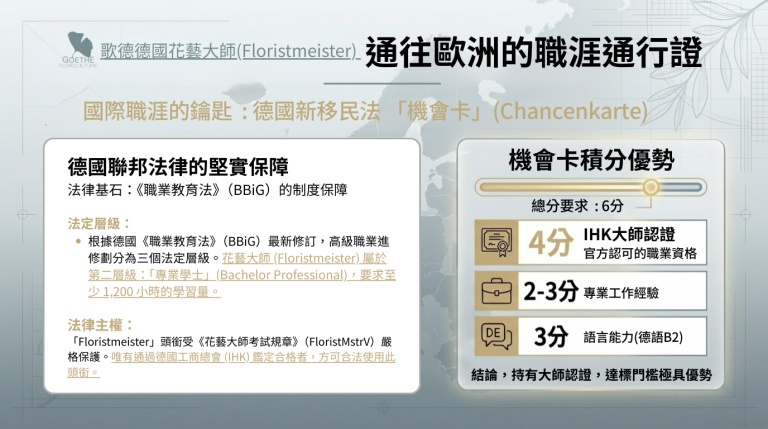 2024 年德國實施的「機會卡」政策,持有 IHK 鑑定證照的專業人才具備顯著積分優勢。在總分 6 分即可申請的體系中,此類官方認可的資格通常能直接獲得 4 分,是通往歐洲工作與花藝設計職涯的綠色通道 。