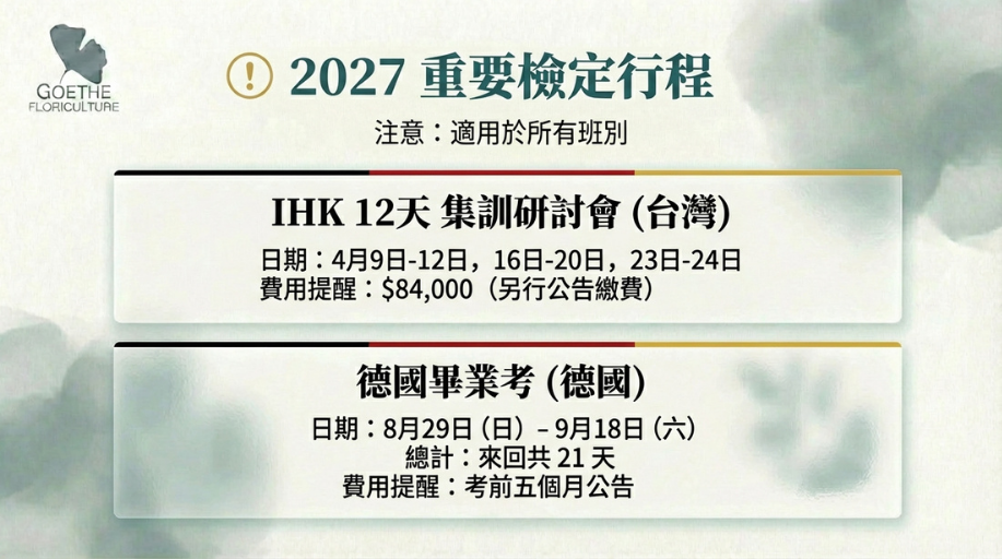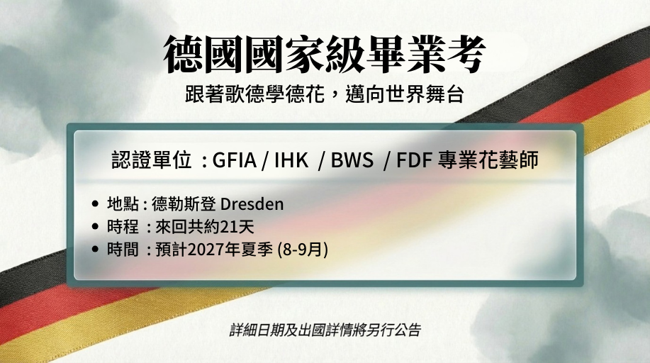 - 德國畢業考之旅: 2027/08/29 – 09/18。來回共 21 天,赴德親身感受德國花藝師的社會地位與專業榮耀。