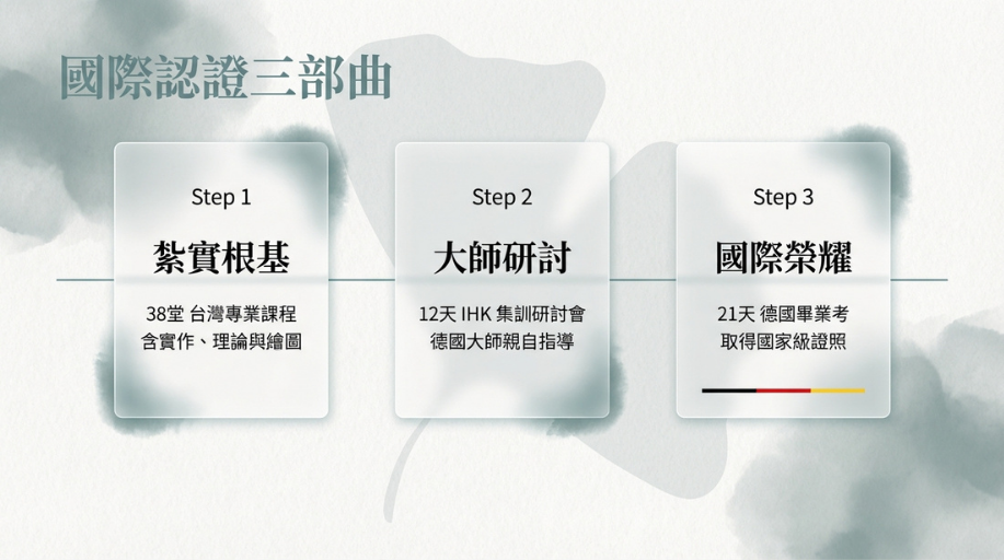 A: 歌德 RT 班對標的是「德國國家職業標準」。除了技法,更強調空間設計、繪圖與成本控制。這是一張能讓你在高端禮儀市場、五星級飯店專案中,直接跳過比價、獲得「定義權」的通行證。