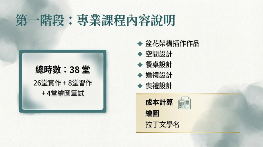 - 4 堂繪圖筆試課: 職業花藝師必須能與建築師對話。我們教你繪製設計圖、計算精確成本與掌握拉丁文學名,確保在高階進口花材貿易鏈中零誤差。