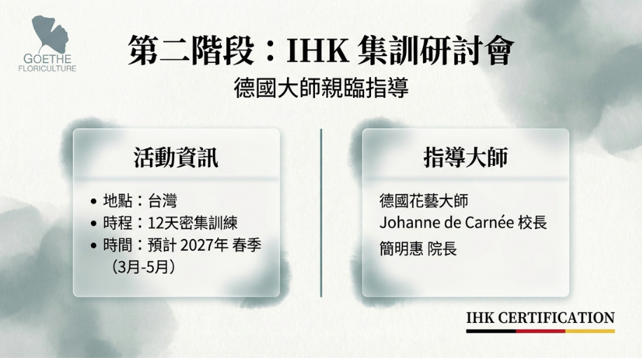 - IHK 12天集訓研討會 (台灣): 2027/04/09 – 04/24。這是與德國本院大師深度對話的時刻。