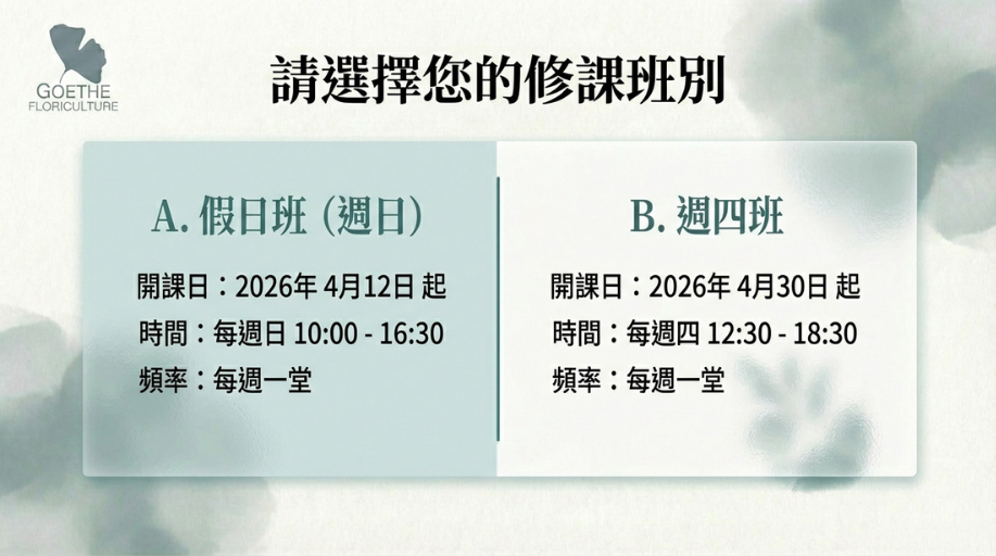 | 假日班 | 2026/04/12 (日) | 10:00-16:30 | 適合現職花藝師與進階轉職者 |